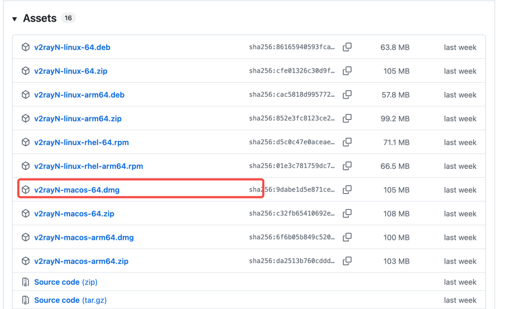 这里使用Github大佬2dust的V2rayN软件,http://github.com/2dust/v2rayN/releases,找到适合自己系统版本的下载安装他的软件。我的是m系列芯片的macbook,就选择mac版本的dmg文件下载,非常方便。