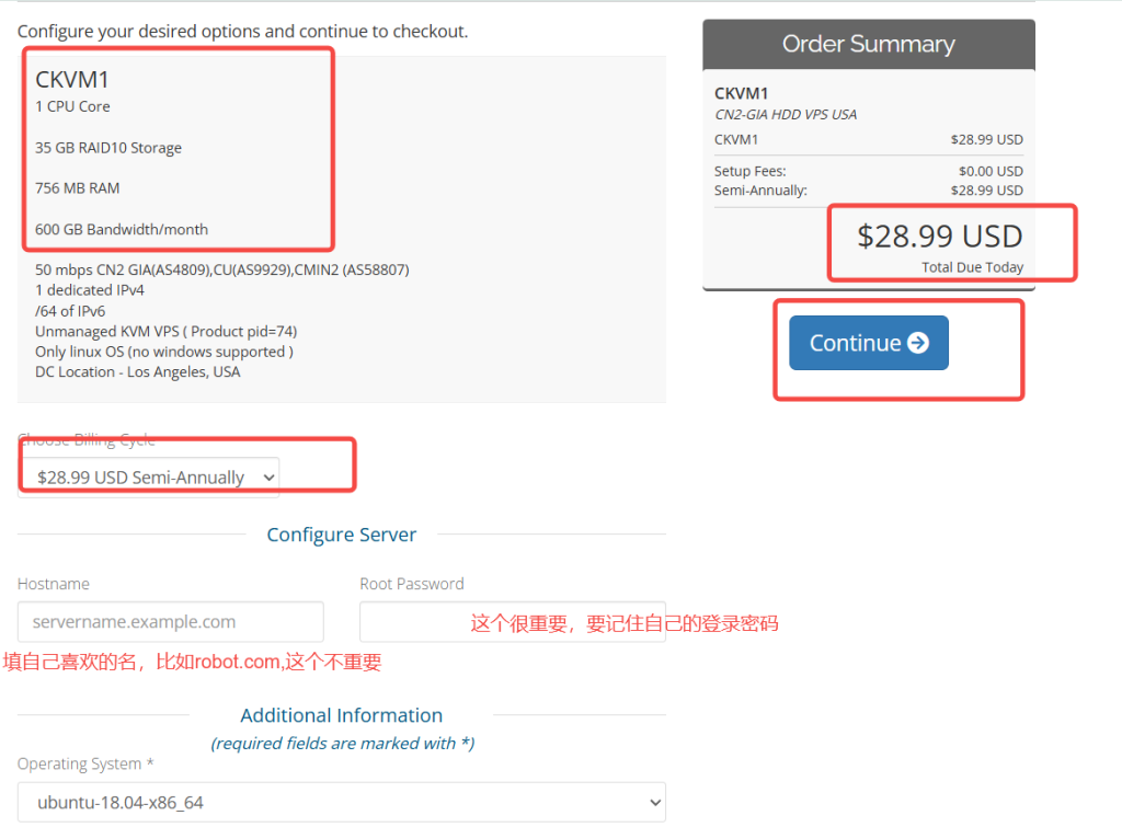 点击一个套餐后就会来到以下的页面,可以看到自己的套餐内容,然后要选择【购买时长】,填写自定义的网站名和密码(这个要记住),选择系统要选ubantu最新的版本,完成后点击【continue】去到下一步。