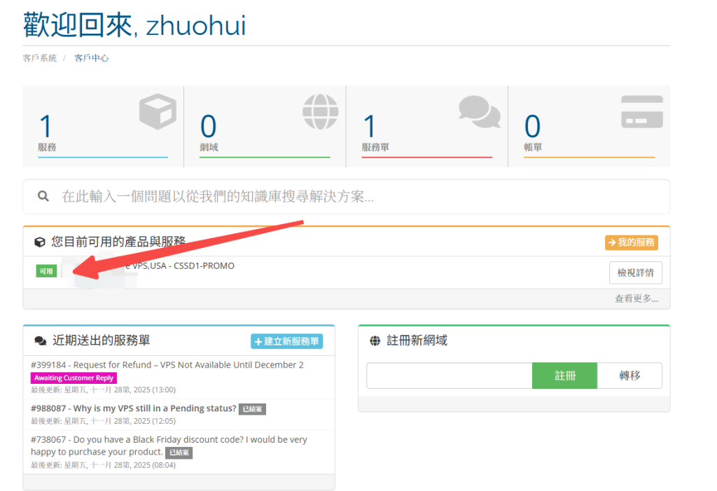 去到订单页选择支付,然后你会来到填写信心并且注册/登录hostdare账号的页面,在这里你只要关心你的【密码】、【地区】、【邮箱】是填自己正确的信息即可,其他都可以乱写。购买后应该会在3分钟后就能看到自己的后台和已经激活的服务器。点击去自己的服务器后台,查看必要的信息。在这里只要记住自己服务器的IP地址和密码即可,至此已经完成教程的第一步!恭喜!